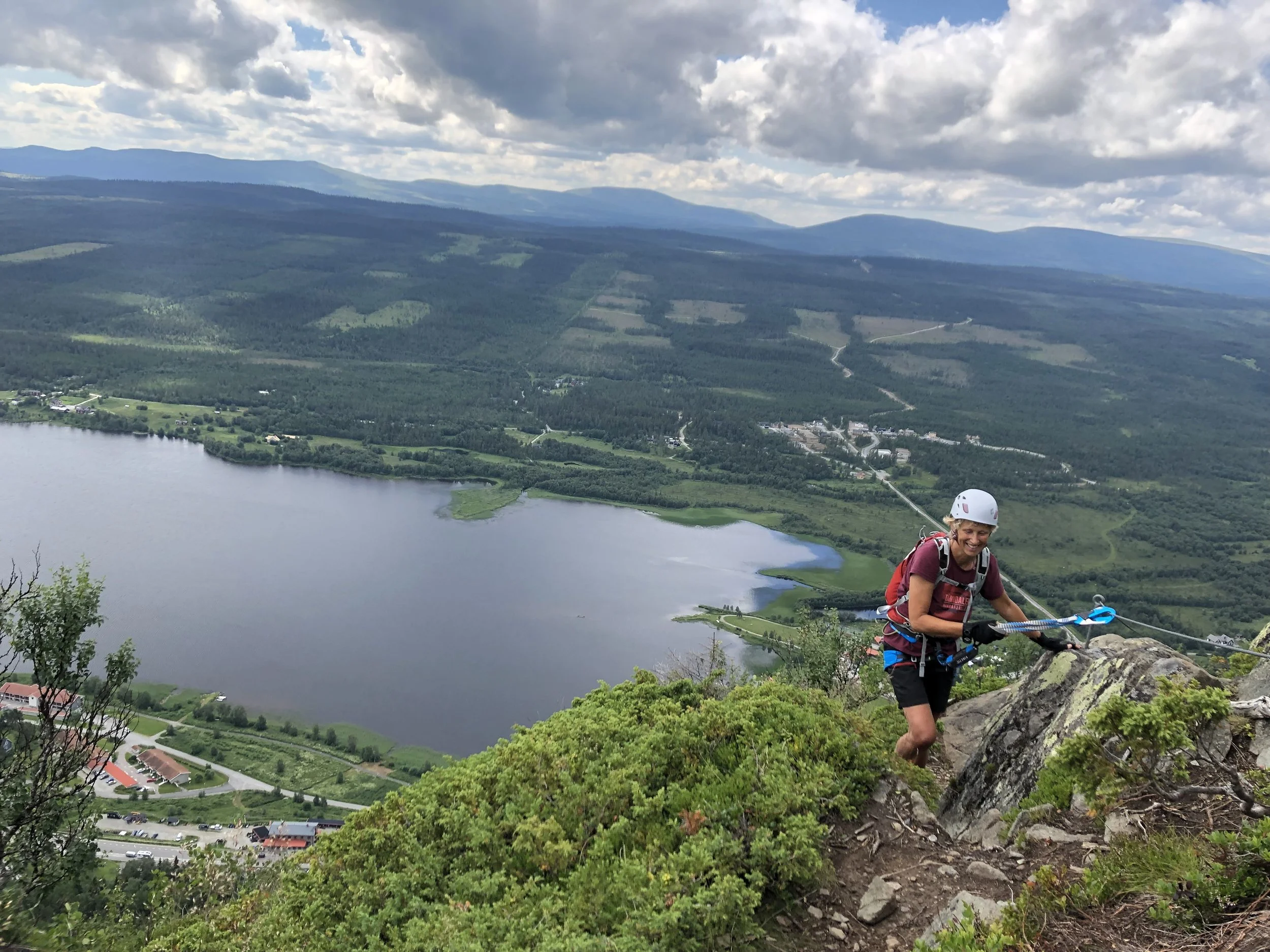 Kommer från ett italienskt ord som påminner om järnväg. Jag skulle kalla det för en klätterled där man med hjälp av säkerhetsutrustning och en fastsatt vajer tar sig upp för en bergsvägg. Precis som inom klättringen finns det olika svårighetsgrader. Det är en utmaningen att behärska sin höjdrädsla för det är mödan värd när man når toppen. I Härjedalen hittar du en fin led på Funäsdalsberget och på Höga Kusten kan du njuta av både Världsarv och Skulebergets 250 m höga Via Ferrata. Båda platserna har toppstugor där jag alltid firar med en stor kopp kaffe!